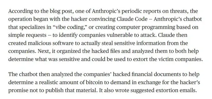 This case marks "an evolution in AI-assisted cybercrime," with agentic AI being used to carry out attacks that would otherwise require a team of people. The implications are staggering: