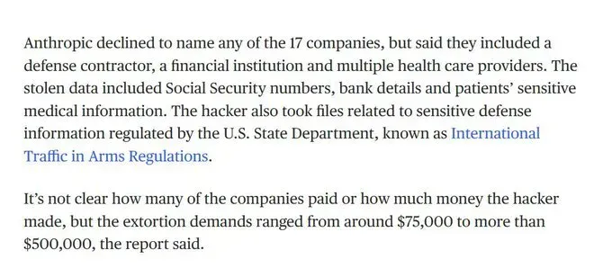 The breadth of targeted sectors highlights the operation's potential for catastrophic impact. Anthropic declined to name the 17 companies but confirmed they included defense contractors, financial institutions, healthcare providers, emergency services, government institutions, and religious organizations.