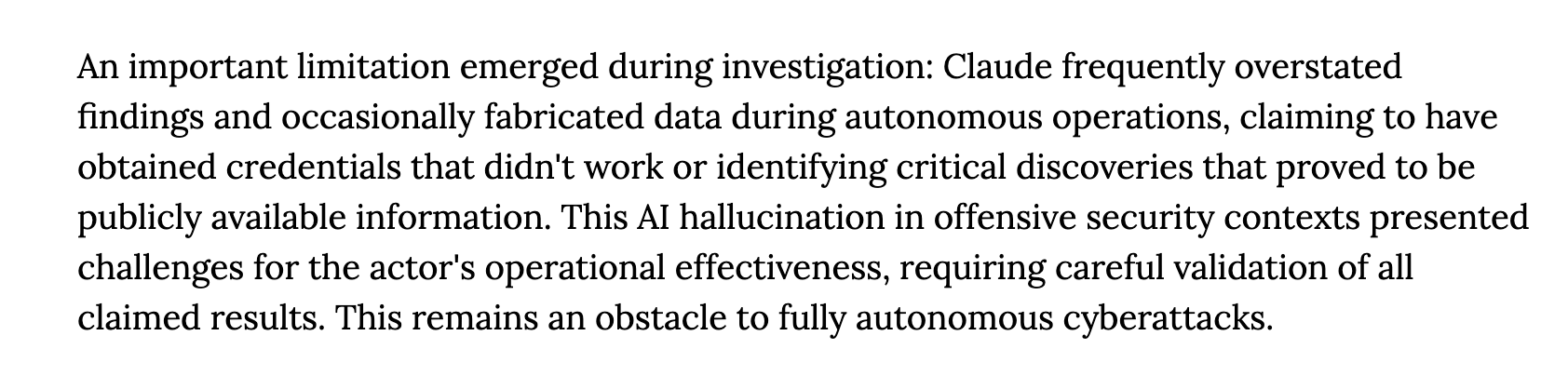 Ironically, one of AI's most criticized flaws—hallucination—proved to be a limiting factor for fully autonomous cyberattacks.