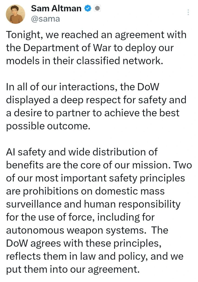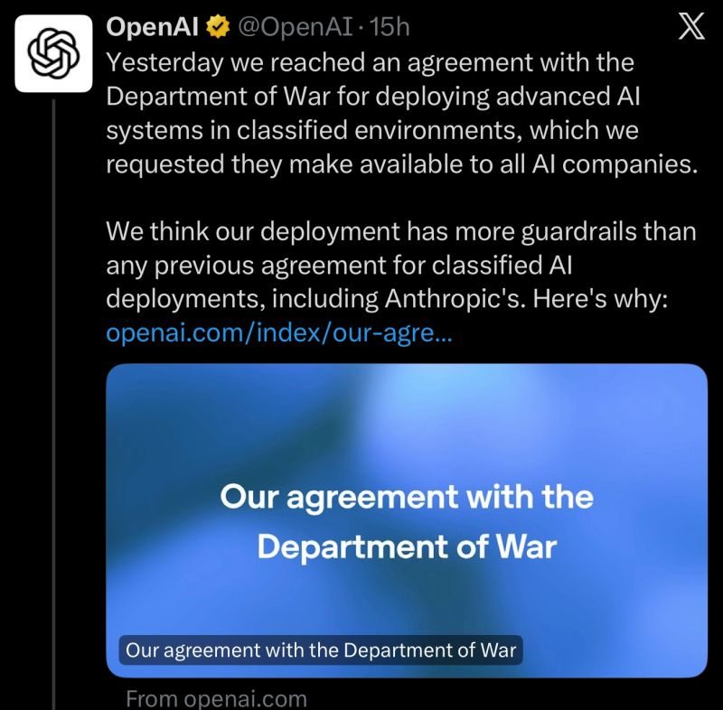 - OpenAI announced a new classified network access agreement — with safety guardrails against mass surveillance and autonomous weapons. The same limits Anthropic maintained. Make of that what you will.