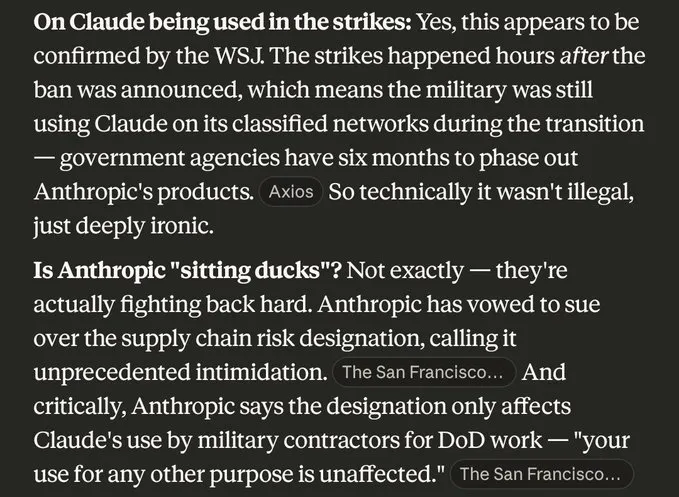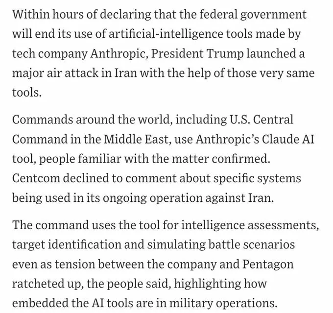 Accountability in AI-assisted targeting: Claude helped identify targets. Humans approved the strikes. When AI is doing the analytical work of narrowing and vetting who gets hit — and those targets are subsequently struck — the accountability chain becomes genuinely unclear. The legal frameworks haven't caught up with the operational reality.