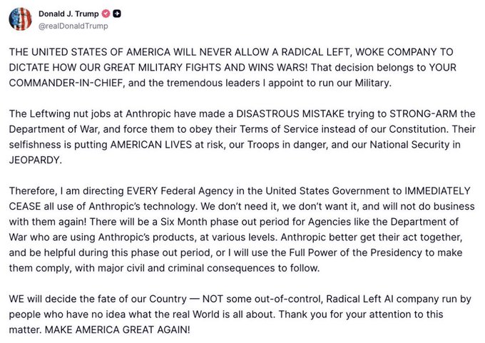 February 27, 2026 — Morning: Trump posts on Truth Social calling Anthropic a "radical left, woke company" and orders all federal agencies to immediately cease using Anthropic's technology. A 6-month phase-out window is granted for agencies currently relying on it.