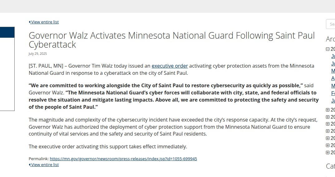 "The magnitude and complexity of the cybersecurity incident have exceeded the city's response capacity," Walz announced in an executive order that took effect immediately. "The Minnesota National Guard's cyber forces will collaborate with city, state, and federal officials to resolve the situation and mitigate lasting impacts. Above all, we are committed to protecting the safety and security of the people of Saint Paul."