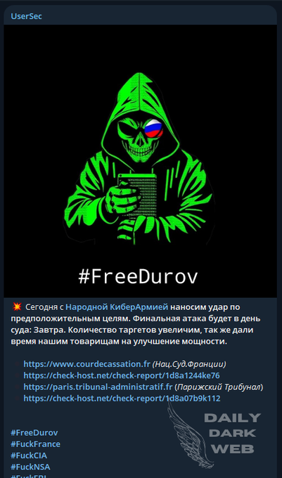 UserSec, a notorious cyber threat actor group, was one of the first to respond to the news of Durov’s arrest. The group issued a call to action, urging others to join in their efforts to retaliate against the French government. Leveraging Durov’s own platform, UserSec declared their intention to carry out widespread Distributed Denial-of-Service (DDoS) attacks against French institutions.