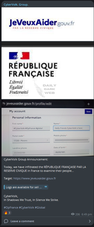Another significant player in the retaliation campaign is CyberVolk, a group that quickly claimed responsibility for infiltrating French government systems. They specifically targeted the Réserve Civique website, which is a key component of France's civic engagement and volunteer services. CyberVolk’s announcement included the release of sensitive information obtained from their breach, showcasing their ability to access and manipulate French government databases.