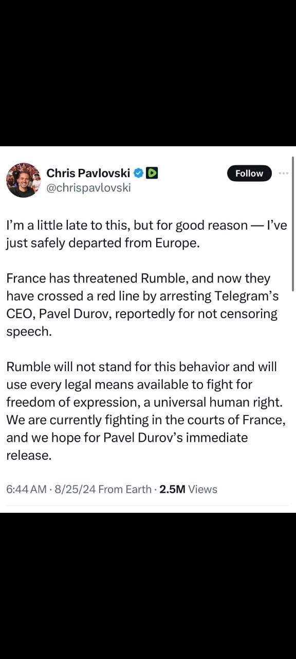 Rumble CEO Chris Pavlovski Responds to France's Actions Against Telegram's Pavel Durov