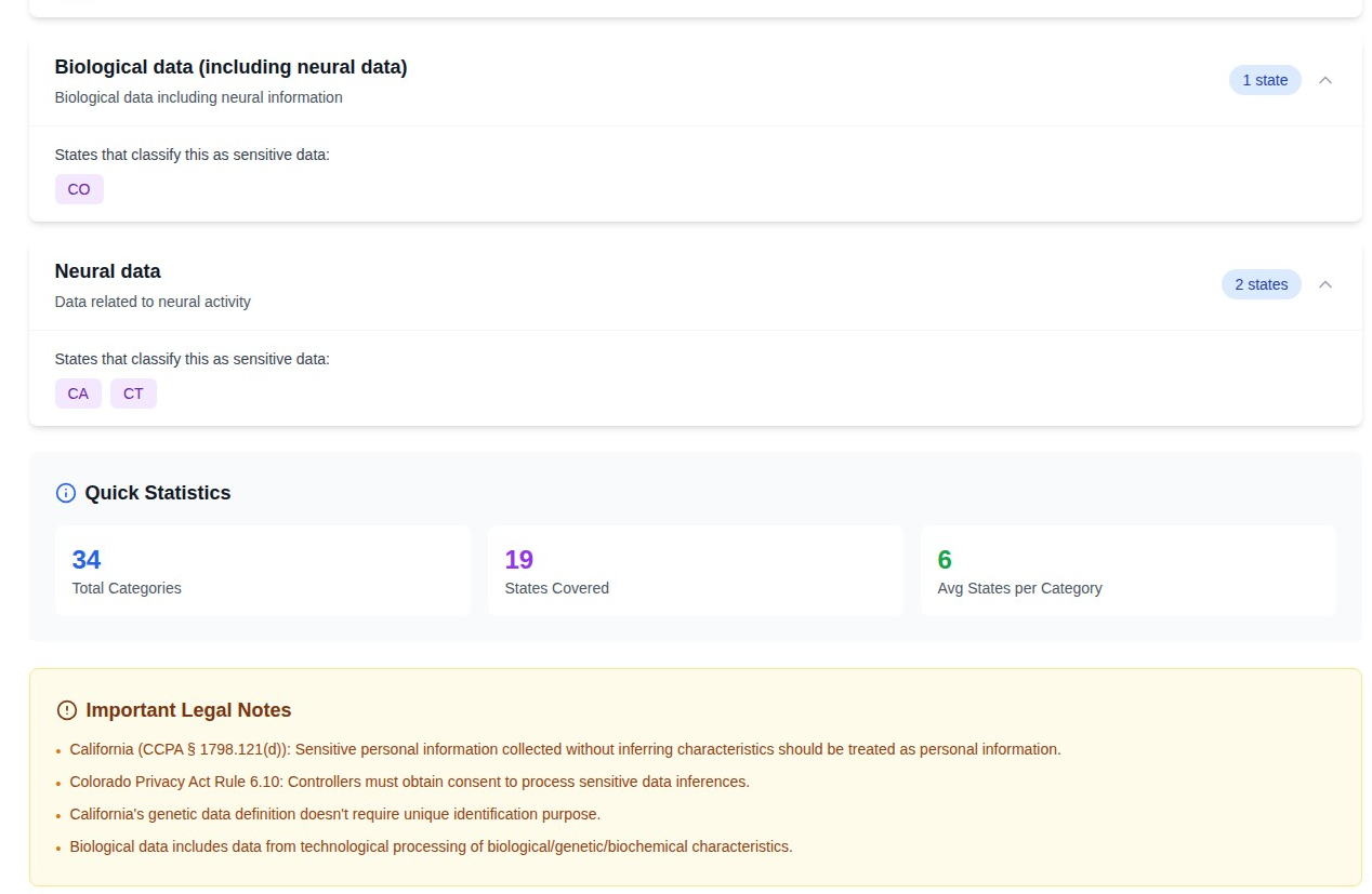 - Emerging Categories: Colorado's biological data protections and California's neural data classifications signal where privacy law is heading