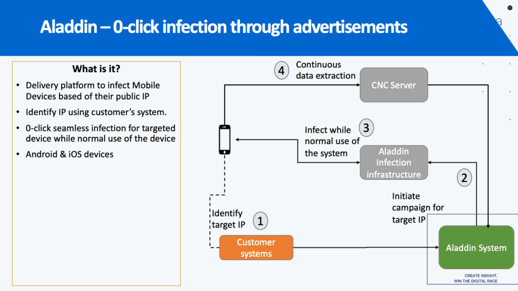 The system infects target phones by forcing a malicious advertisement to be shown on the target's device, with internal company materials explaining that simply viewing the advertisement is enough to trigger the infection—no click required.