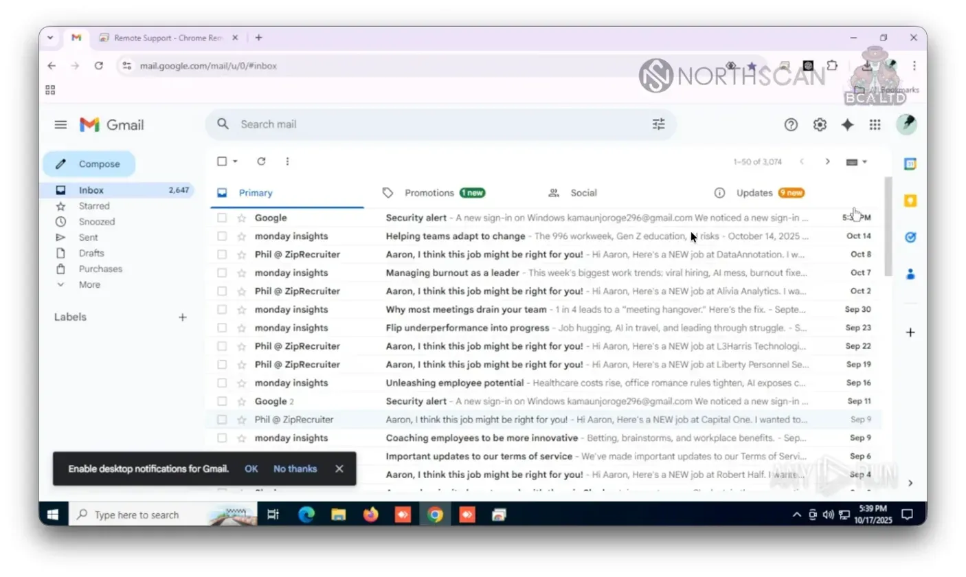 Google Remote Desktop was configured via PowerShell scripts using a fixed PIN, providing continuous control of the host machine without requiring malware installation. This legitimate tool usage helps operators avoid detection by traditional security solutions.
