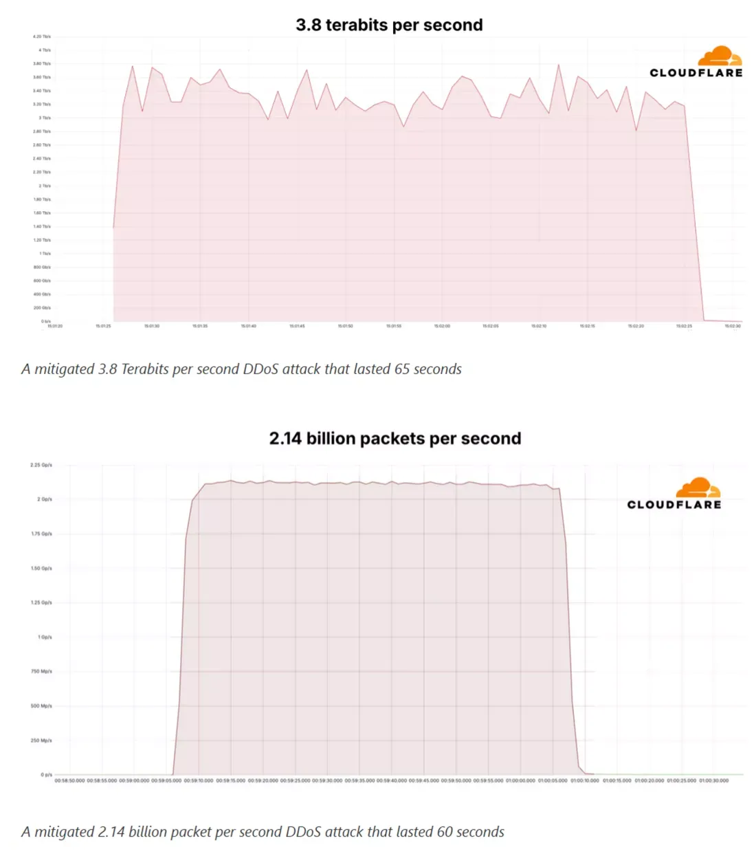 What made this attack even more remarkable was the scale and speed of the data being transmitted. The record-breaking 3.8 Tbps peak represented an immense challenge for any infrastructure. For comparison, Microsoft previously held the record at 3.47 Tbps in 2021, which targeted an Azure customer. The Cloudflare attack broke this record and introduced a new benchmark in the evolution of DDoS threats