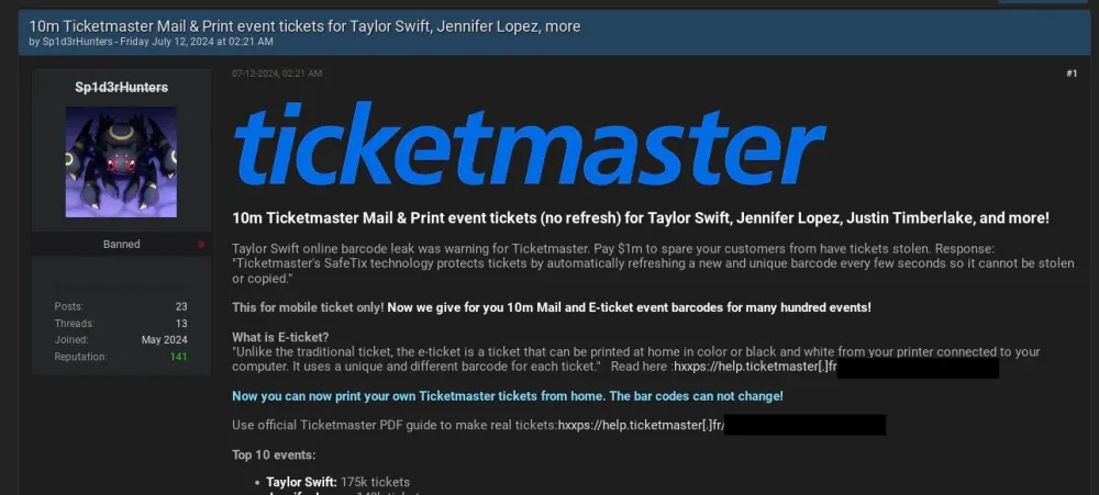Ticketmaster (May 2024): ShinyHunters claimed responsibility for the Ticketmaster breach, affecting over 560 million users, involving up to 1.3 terabytes of data. On July 4, 2024, the ShinyHunters threat group escalated their conflict with Ticketmaster by posting about a further breach. The hackers claimed they initially accepted a hasty $1 million offer from LiveNation, however, upon realizing the data's true value, they raised their demand to $8 million.