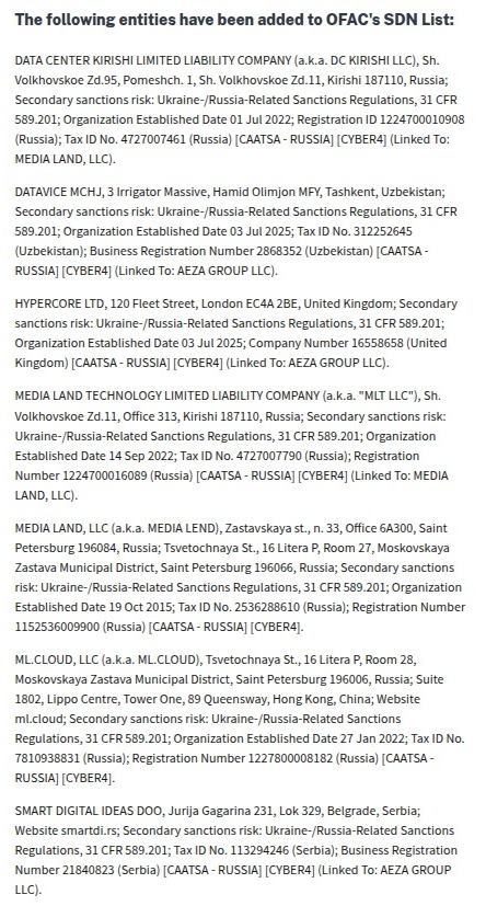 On November 19, 2025, the U.S. Treasury Department's Office of Foreign Assets Control (OFAC), in coordination with Australia and the United Kingdom, announced comprehensive sanctions targeting Media Land LLC and its entire operational network. The detailed sanctions designations named three key executives, three sister companies, and revealed the cryptocurrency wallets used to facilitate their operations.