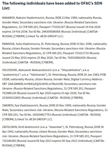 The November 19, 2025 Treasury designations exposed this evasion network in detail. Maksim Vladimirovich Makarov emerged as Aeza's new director, making key decisions regarding sanctions evasion. Ilya Vladislavovich Zakirov helped establish new companies and payment methods to obfuscate Aeza's continuing activity.