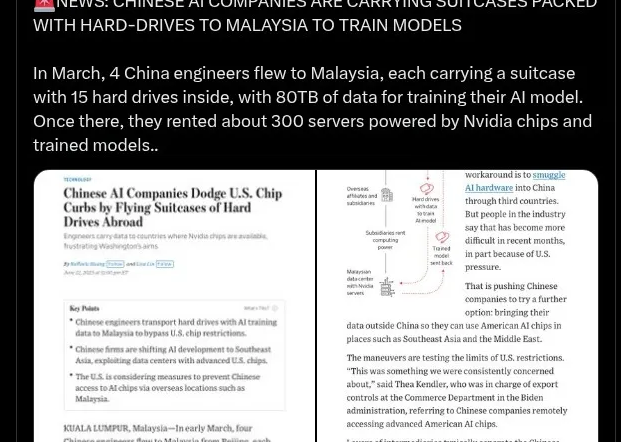 The operational complexity reveals both the value of these workarounds and their limitations. Setting up local operations and manually transporting data on hard drives makes AI training far more complicated than conducting it domestically in China. Yet as direct hardware smuggling becomes more difficult, Chinese companies are adapting by exporting their most valuable asset—data—instead of importing restricted chips.