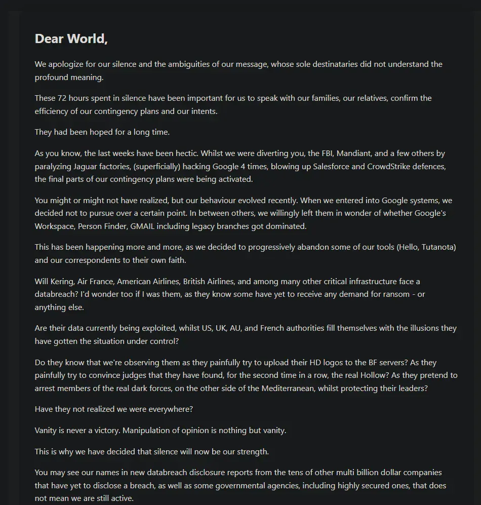 The tone is simultaneously boastful and melancholic, defiant yet resigned. They reference their high-profile attacks—"paralyzing Jaguar factories, (superficially) hacking Google 4 times, blowing up Salesforce and CrowdStrike defences"—while suggesting these spectacular breaches were merely distractions from their real objectives.