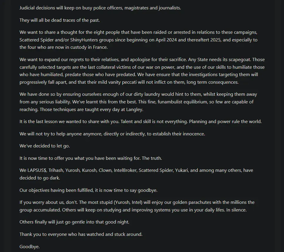 In the early hours of September 12, 2025, the cybercrime underground was stunned by an extraordinary announcement. Scattered Lapsus$ Hunters, the group behind some of the most brazen corporate breaches of the past two years, posted what appears to be their final message: a retirement notice that reads more like a manifesto than a goodbye.