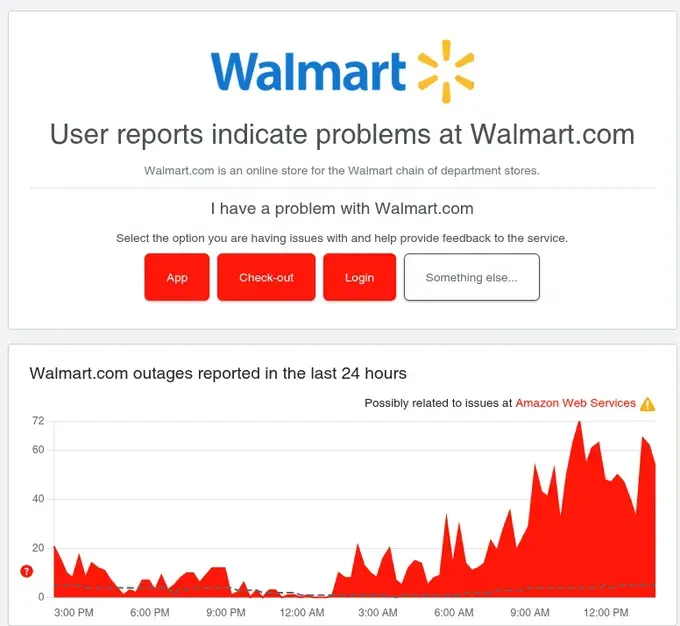 Vanguard's status page showed the problem clearly: "Possibly related to issues at Amazon Web Services ⚠️" with outage reports spiking from near-zero to 232 in minutes. PayPal showed the same pattern. So did Twitch. And Walmart. And dozens of others.