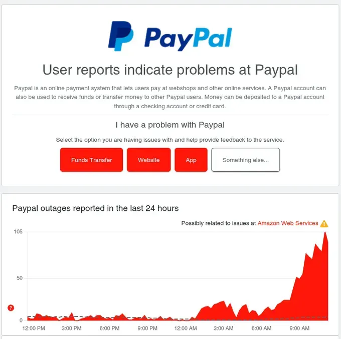 PayPal: Similar spike in outage reports with AWS correlation flagged