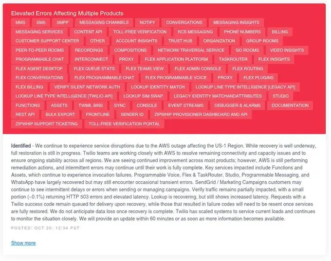 Twilio: "We continue to experience service disruptions due to the AWS outage affecting the US-1 Region... Functions and Assets, which extend across most Twilio products, Programmable Voice, Flex & TaskRouter, Studio, SendGrid/Message Streams, Studio, Programmable Chat, InterConnect, WhatsApp have largely recovered but may still encounter occasional transient errors."