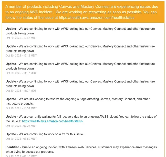 Instructure/Canvas (learning management system used by millions of students): "A number of products including Canvas and Mastery Connect are experiencing issues due to an ongoing AWS incident."
