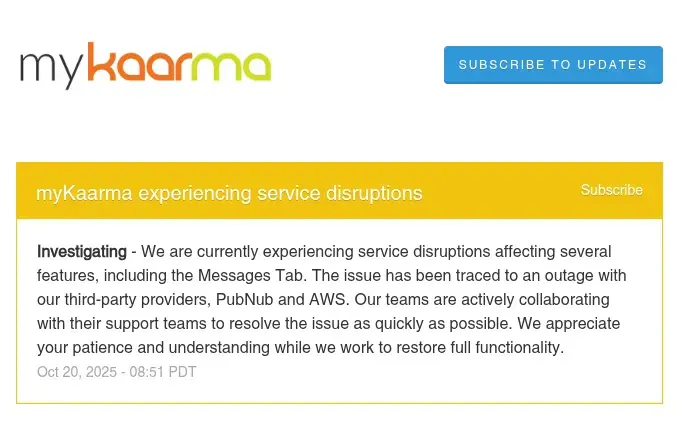 myKaarma (automotive software): "We are currently experiencing service disruptions affecting several features, including the Messages Tab. The issue has been traced to an outage with our third-party providers, PublicHub and AWS."
