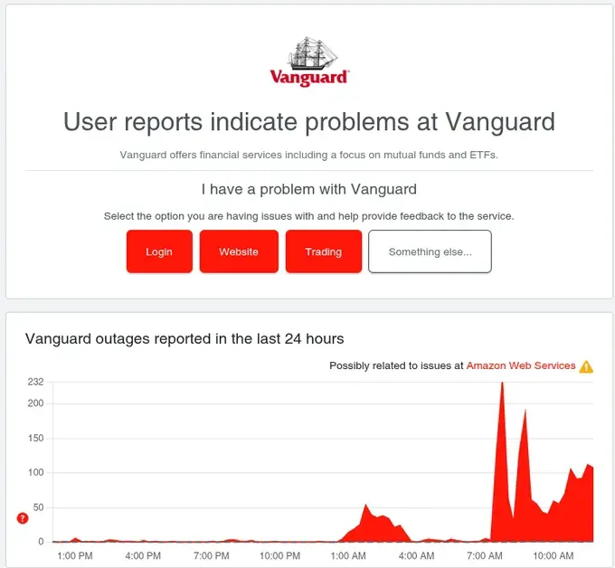 Vanguard (financial services): Outage reports spiked from baseline to 232, with "Possibly related to issues at Amazon Web Services ⚠️"