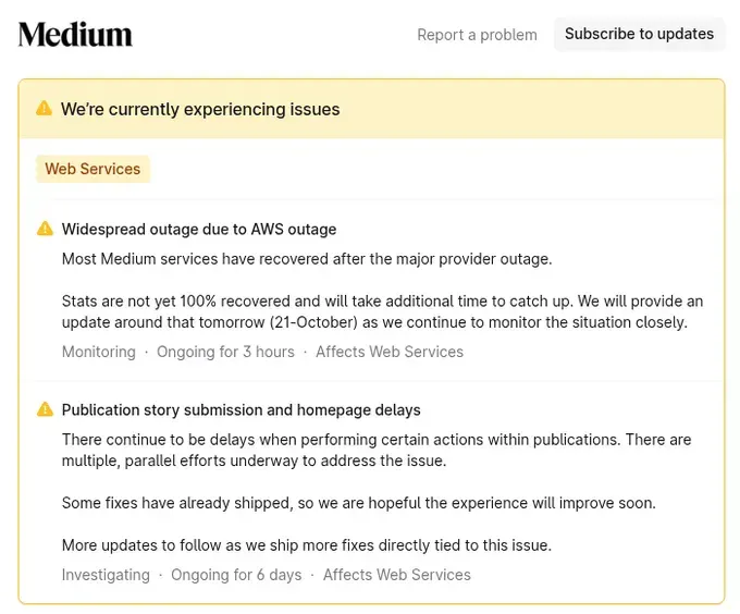 Medium: "Widespread outage due to AWS outage. Most Medium services have recovered after the major provider outage. Stats are not yet 100% recovered and will take additional time to catch up."